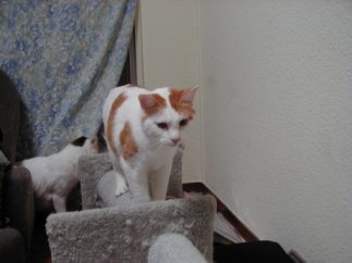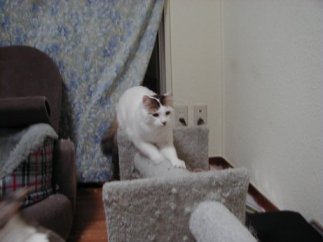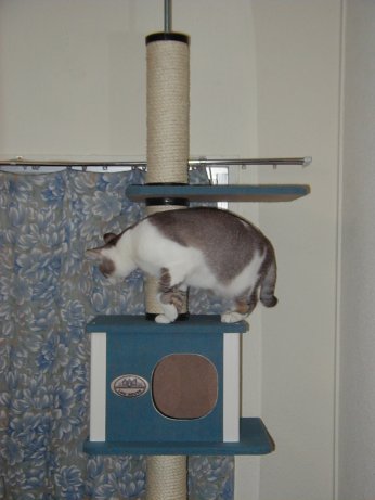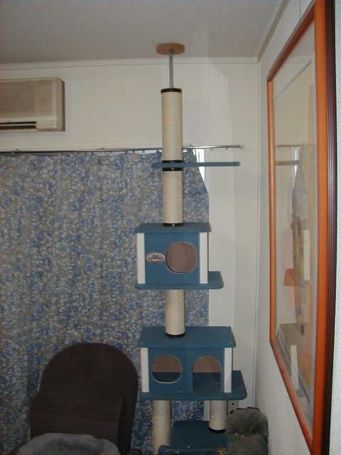 ・↓今回購入したキャットタワーです。以前のと比べハウスもついてりっぱになりました。 このメーカーの物はパーツごとに交換がきくので、長く使えそうです。(^^) |