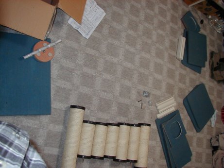 ・↑購入前まで使っていた、キャットタワーのなれのはてです。(^^;) いくら、育ち盛りが5匹もいるとはいえ、あまりの無残さにため息が出ます。 | ・↑解体するために倒したところ、臨時の遊び場となりました |